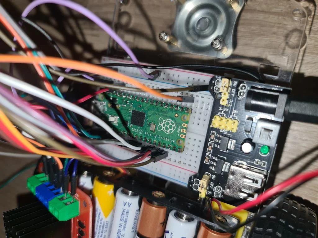 - Two separate battery blocks power the system: One battery pack powers the Raspberry Pi Pico, ensuring that the central computing resources are maintained. The second battery pack supplies power to the motor controller and servo, which require higher current for operation.